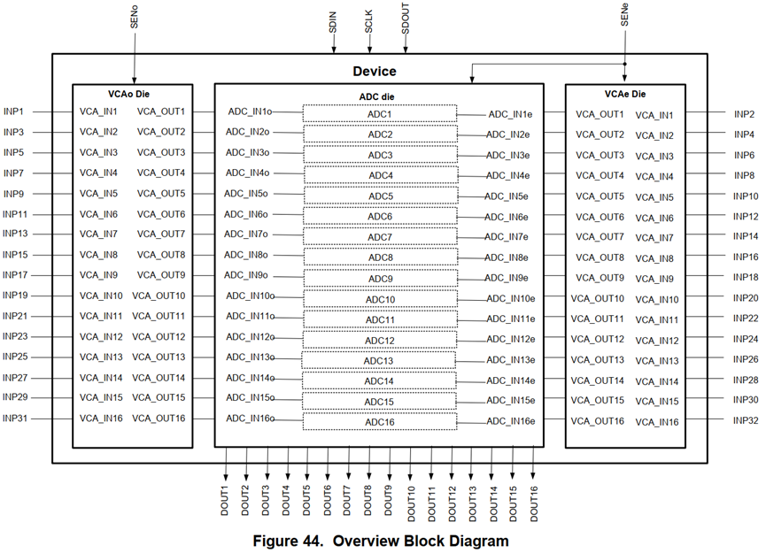 上图为一片AFE5832的输入输出通道和内部大致模块划分,一片AFE5832,共32个通道,但是可以看到上图中心框,ADC die中只有16个ADC,左右框分别是VCAo Die和VCAe Die,其中VCAo为奇数通道,VCAe为偶数通道,可以看到左右两侧INP1INP32,共32个输入通道,其中通道号为奇数的131通道连接到左侧VCAo Die,通道号为偶数的2~32通道连接到右侧的VCAe Die,然后下方输出的LVDS接口,则是输出16个数据通道;