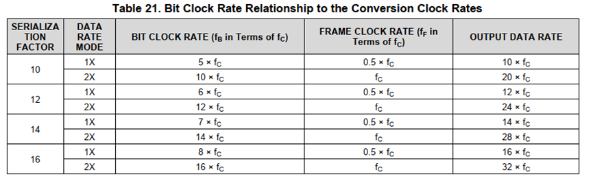 上图中,默认设置是使用12bit 40MSPS模式,若改为10bit 50MSPS模式,那么采样率为50M,fc = 100MSPS,在1x数据模式中可以看到,fc是ADC转换时钟,1x模式中,fc的速率是帧时钟的2倍;
