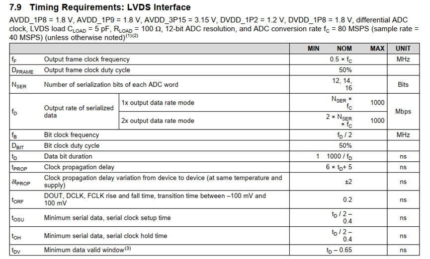 本次实验使用其10位50MSPS模式,LVDS接口时序如下: