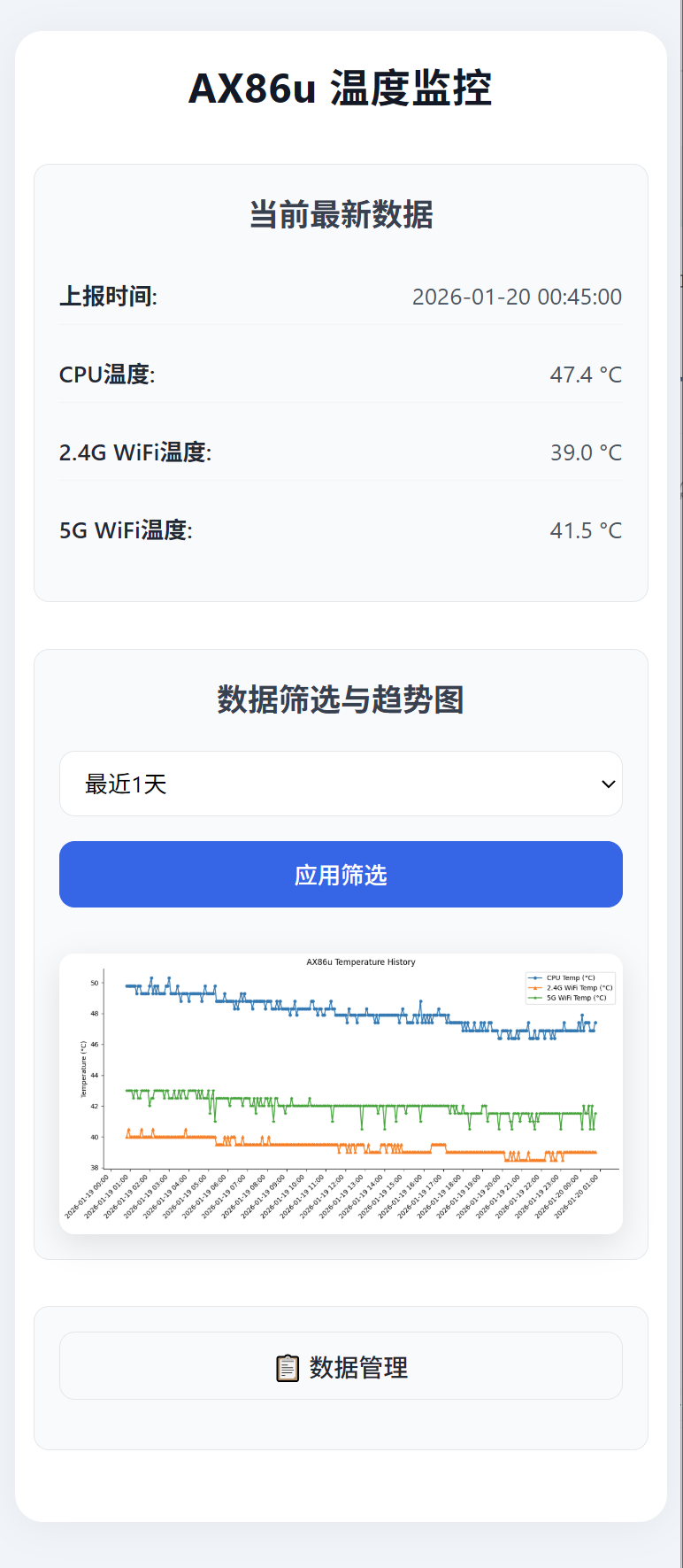方案如下:AX86u按频率上报温度信息给服务器后端,服务端后端负责接收处理数据,和前端展示。服务器后端程序用Python编写,跑在NAS的docker中。