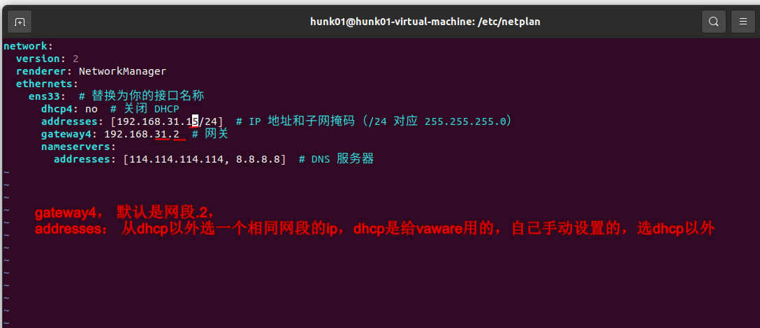 addresses: [192.168.31.15/24] # IP 地址和子网掩码(/24 对应 255.255.255.0)