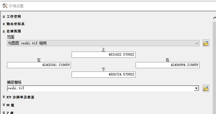 点击工具中的"环境",在环境设置里的"处理范围"中,使范围与测试影像保持一致,防止四至不同,后续预处理出错。