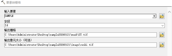 "要素转栅格"工具中,要素为矢量数据,字段为"ID",即赋值"255"的字段名称,选择输出路径与输出像元大小,这里我将输出像元大小与测试影像保持一致。