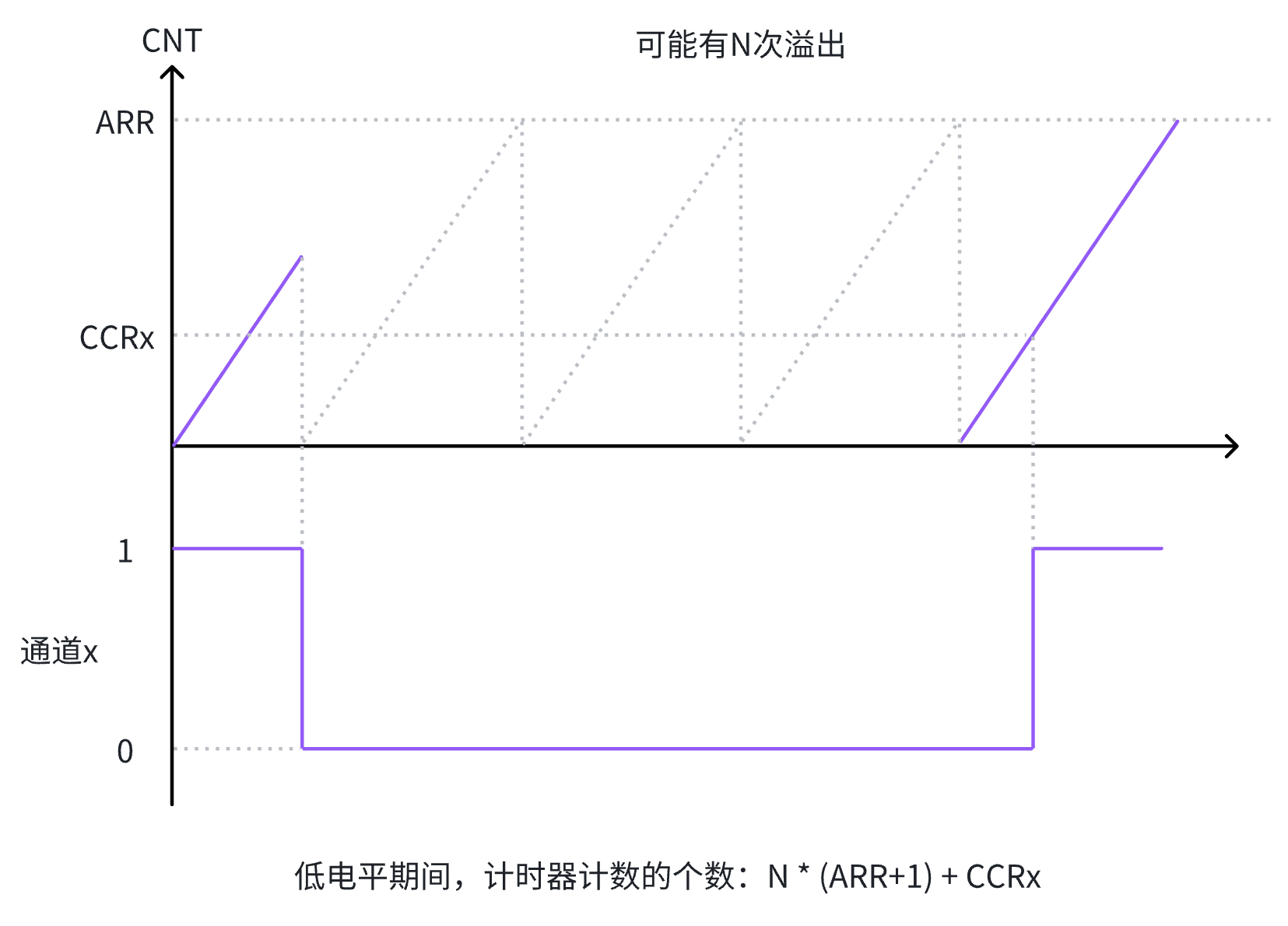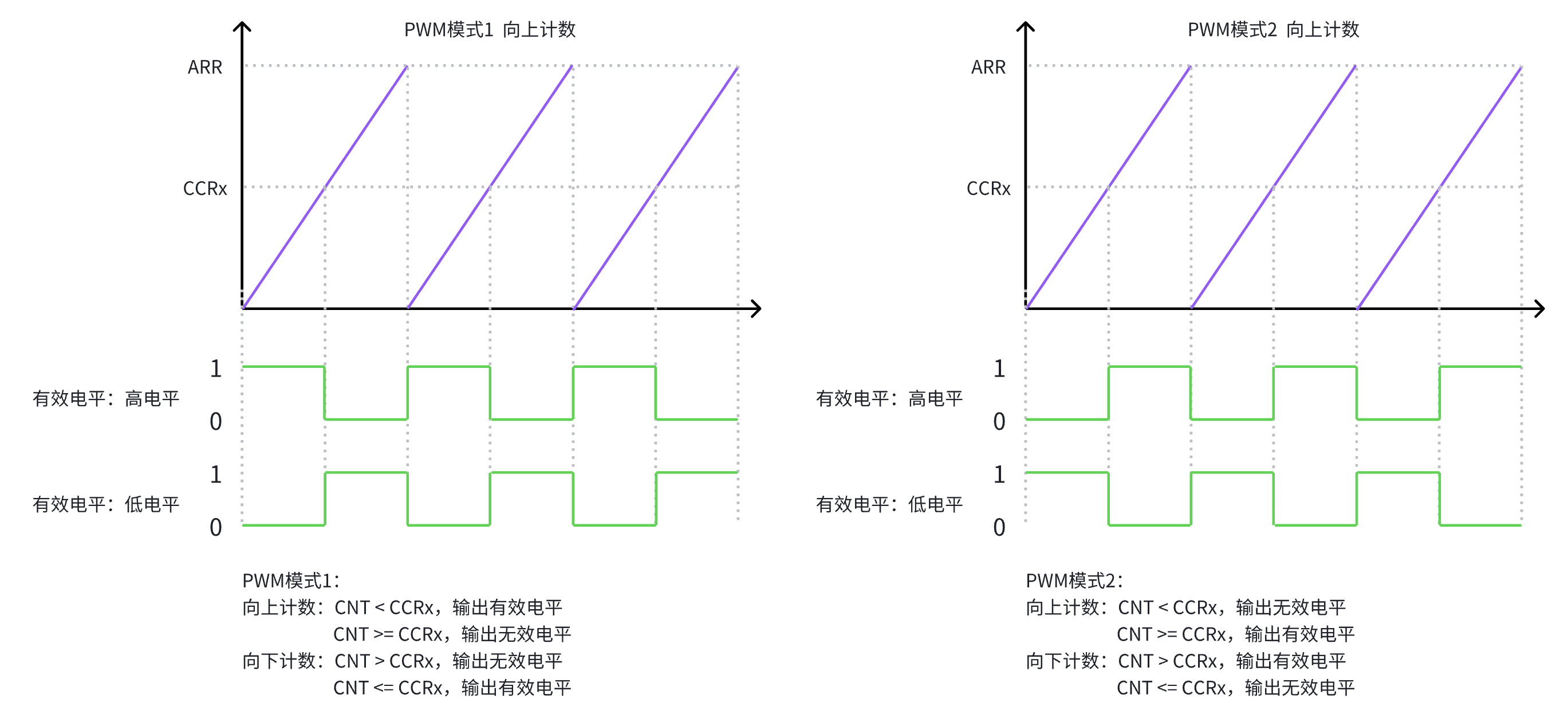 输出比较可以通过 比较定时计数器的值 CNT 与设定的比较值 CCR ,可以控制输出引脚的电平状态 (置高或置低) ,从而实现生成一定频率和占空比的 PWM 波形。