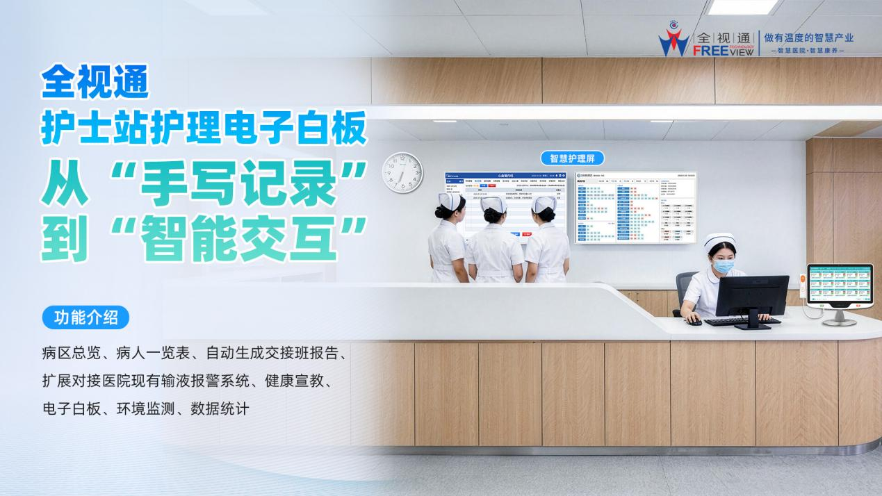 据悉,全视通护士站电子白板系统成功应用于宁波市中医院、西安市第九医院、海军青岛特勤疗养中心、西安交大一附院国际陆港院区、南京鼓楼医院(南京大学医学院附属鼓楼医院)。华东某三甲医院护理部反馈,部署全视通系统后,每位护士日均减少1.5小时非直接护理时间,患者满意度提升13%。某三甲医院反馈交接班遗漏率下降76%。