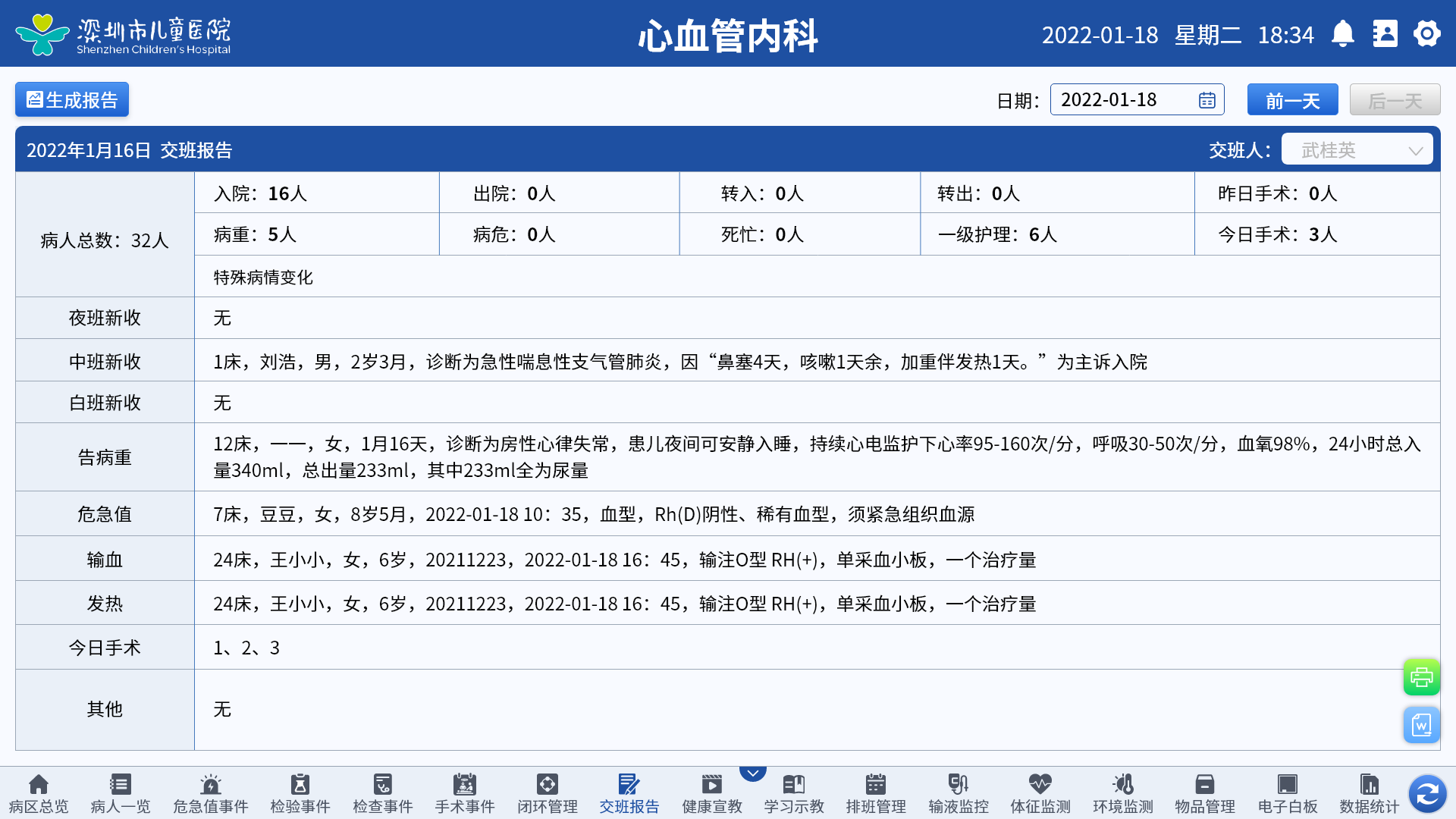 3、动态展示今日入院、出院、手术、检查等关键信息,帮助护士快速掌握全局;