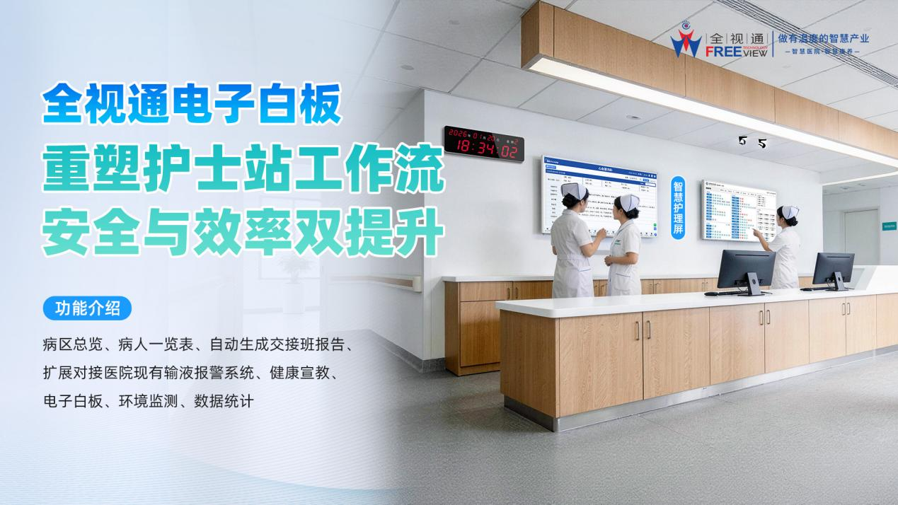 在智慧医院建设不断提速的今天,传统护理工作正面临信息分散、流程繁琐、交接低效等多重挑战。如何让护士从繁杂的文书与重复性事务中解放出来,回归临床、专注患者?珠海全视通信息技术有限公司(以下简称"全视通")以护士站电子白板为核心载体,打造了一套深度融合临床需求的智慧护理交互系统,赋能护理模式的数字化变革。