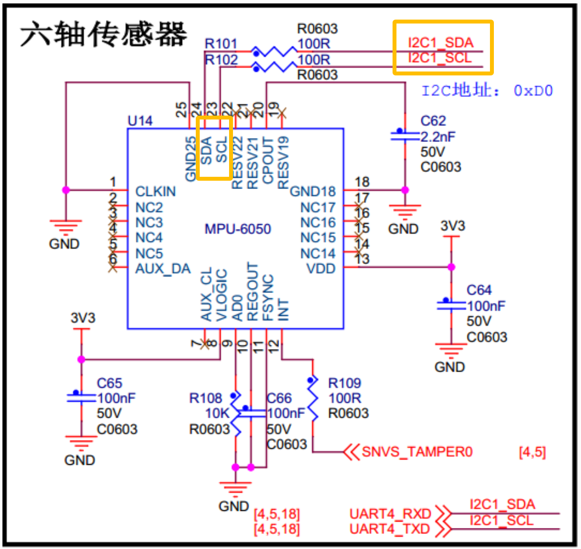 翻译就是:AD0拉低,从机地址为b1101000,即0x68;AD0拉高,从机地址为b1101001,即0x69。图中可以看出,AD0接了下拉电阻,即默认从机地址为0x68。