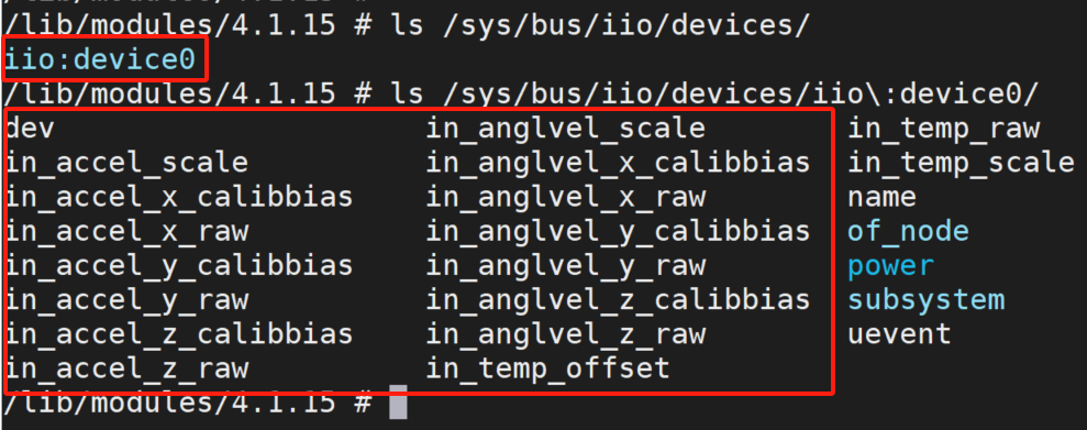 probe成功后,查看/sys/bus/iio/devices下面,发现多了一个device0。查看其下面的内容,可以看到生成的各种文件: