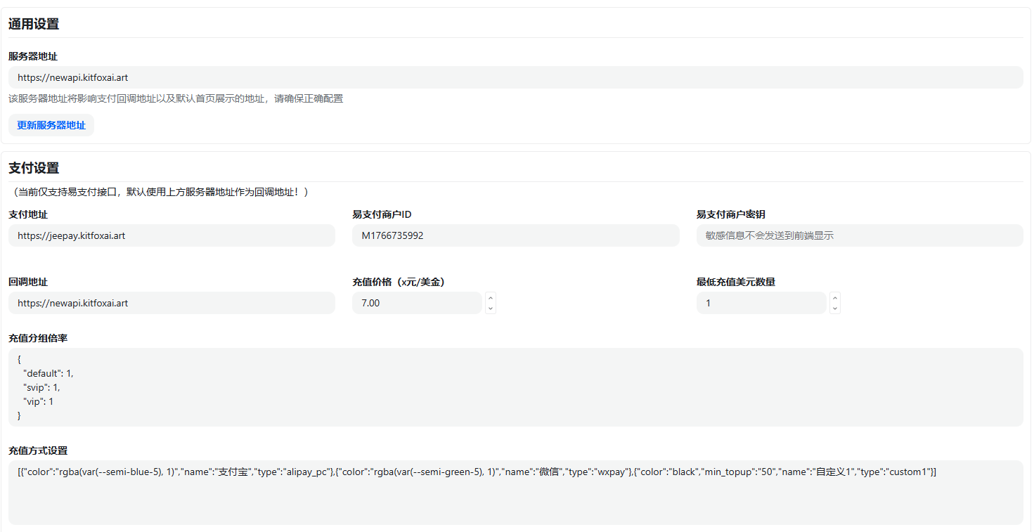 把 NewAPI 配置中的支付接口地址改为 KitfoxPay 地址即可,无需修改代码!