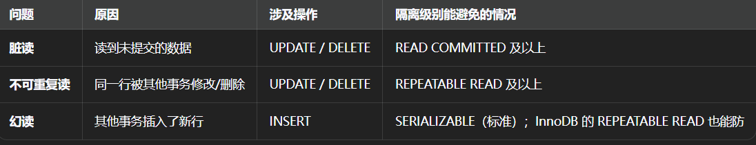 - MySQL InnoDB 在 REPEATABLE READ 级别下通过"Next-Key Lock"(行锁 + 间隙锁)也防止了幻读(这是 InnoDB 的特殊优化,不同于 SQL 标准)。