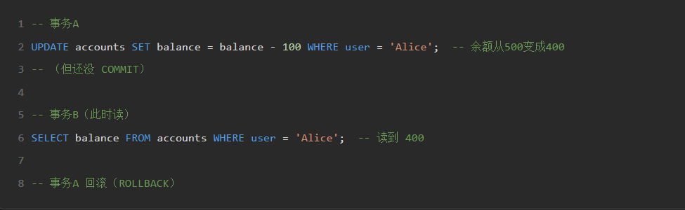 如果那个未提交的事务后来**回滚(ROLLBACK)**了,那么当前事务读到的数据就是"不存在"的、无效的------这就是所谓的"脏数据"。