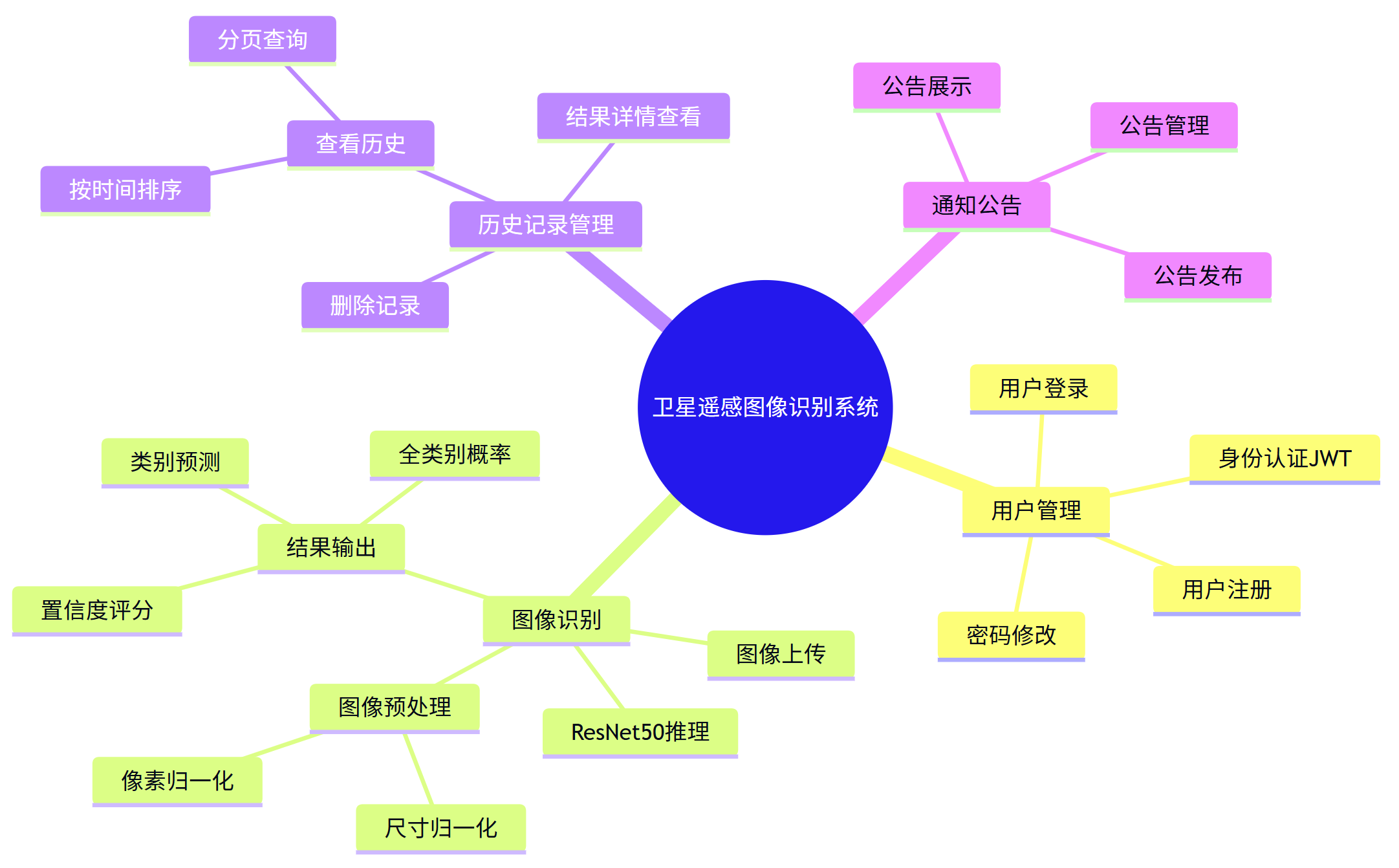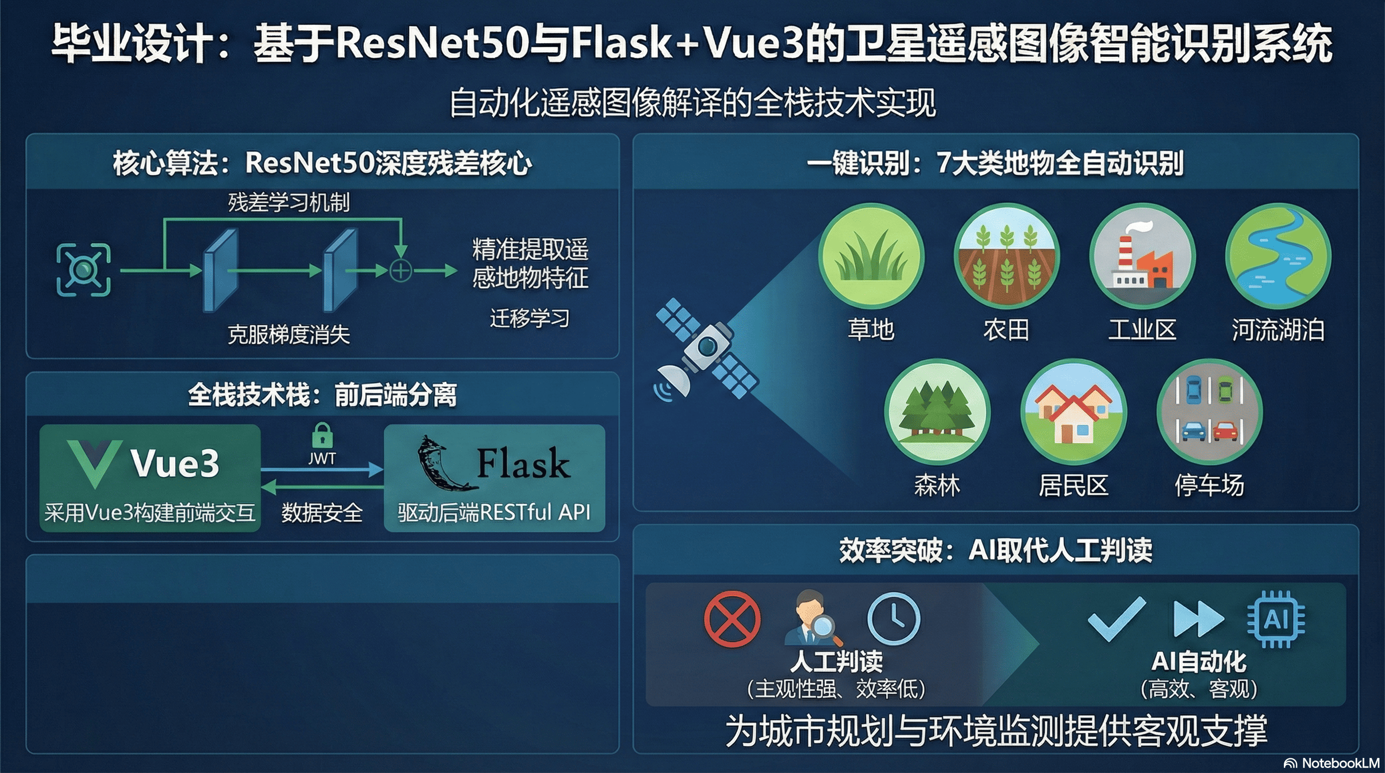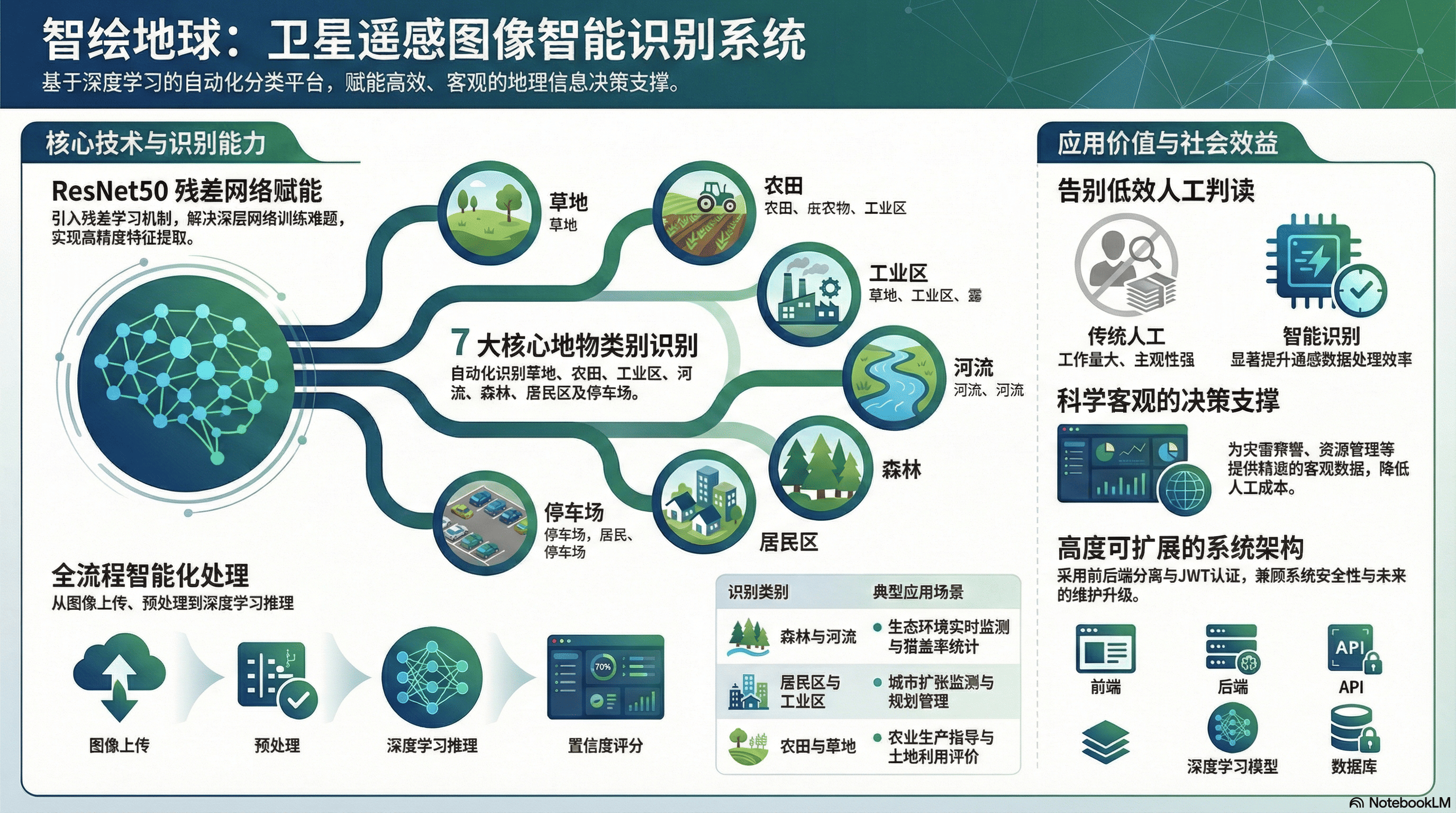 本系统是一个基于深度学习的卫星遥感图像智能识别平台,旨在为用户提供高效、准确的遥感图像分类服务。系统采用Flask轻量级Web框架构建后端服务,集成ResNet50深度卷积神经网络模型,实现了对卫星遥感图像的自动化识别与分类。系统支持识别七大类地物类型,包括草地、农田、工业区、河流湖泊、森林、居民区和停车场,能够满足土地利用监测、城市规划、环境评估等多种应用场景的需求。
