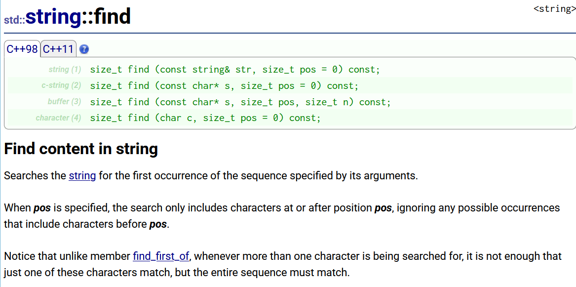 而且由于版本发展,我们这里也会出现多个版本的find函数,但本质作用都是要去查找字符/子串,如果感兴趣,大家可以自己查阅参考文档:
