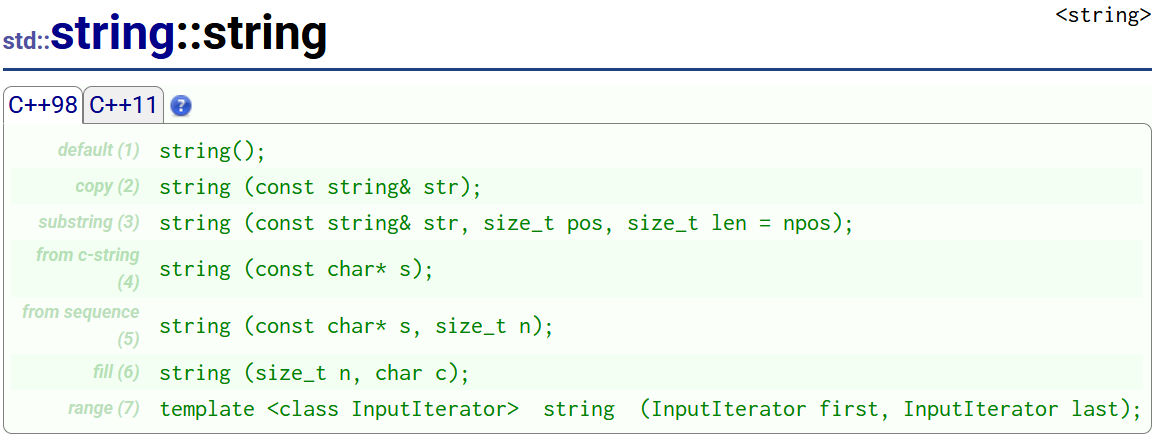 在参考文档中,我们发现string有7中构造函数(本篇博客讨论C++98知识,C++11可能会有拓展,不太适合新手学习):