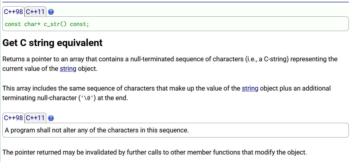 string::c_str参考文档,这个结构返回指向字符串对象值的 C 字符串所表示形式的指针,主要目的是为了兼容c语言: