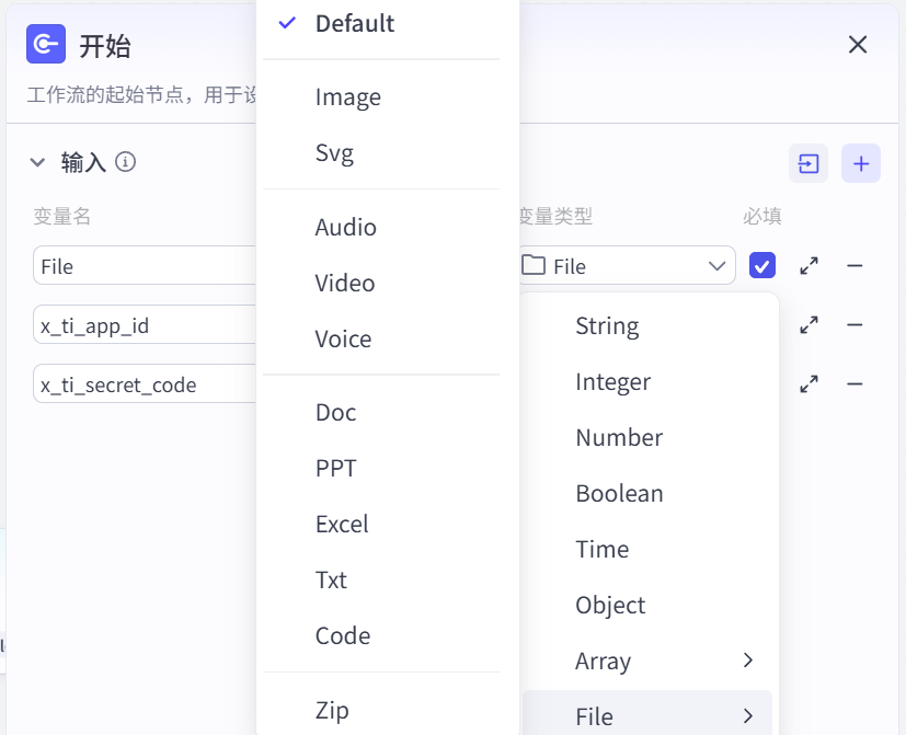 x-ti-app-id与x-ti-secret-code(下文统称 app_id/secret_code)。 - 建议在Coze工作流里把鉴权参数作为开始节点输入 传入(便于不同环境切换),或在团队内部用变量/密钥管理统一配置。