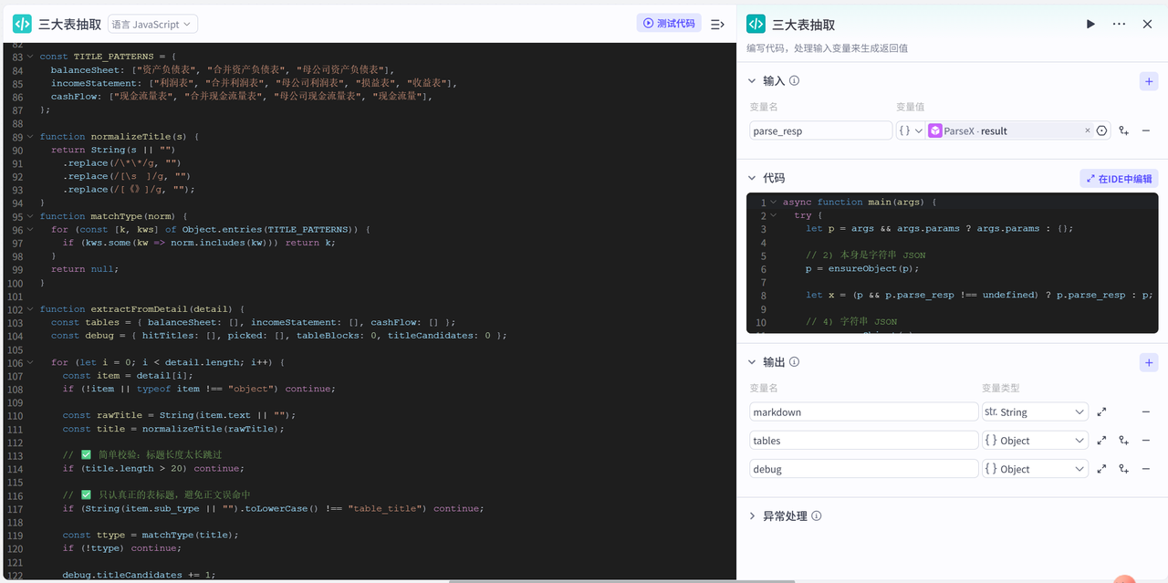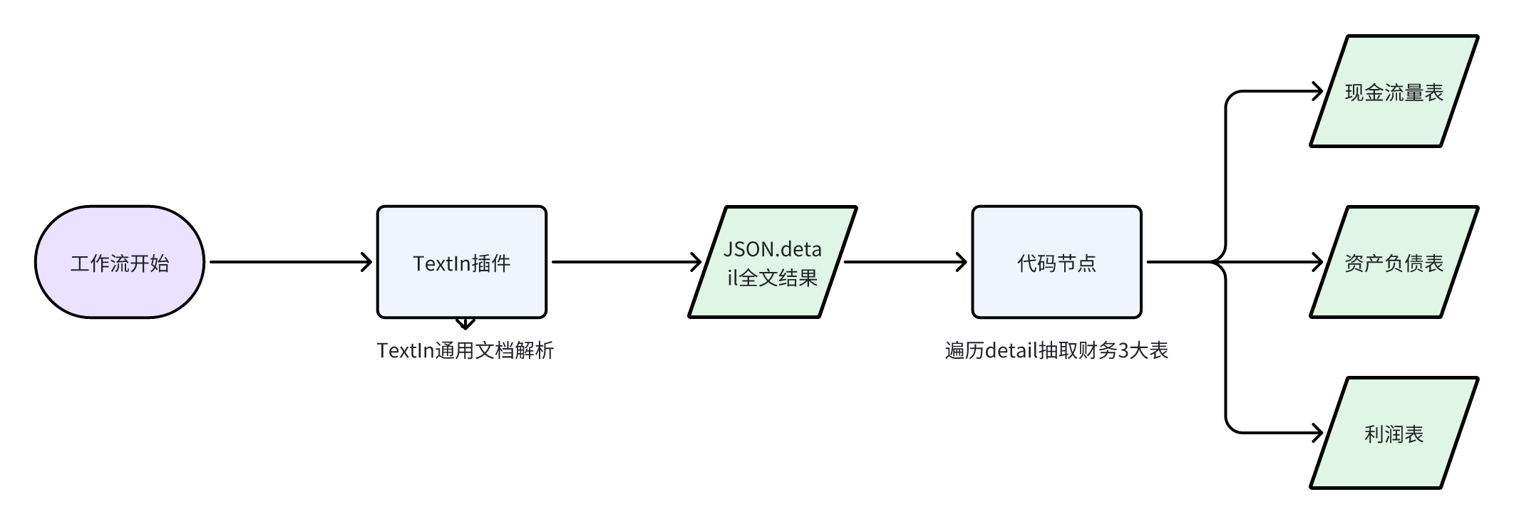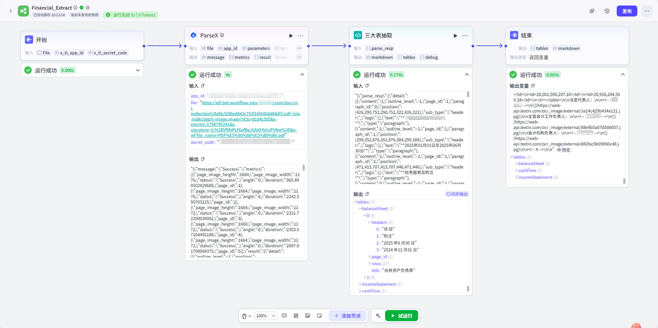 detail,通过"表标题 → 后续表格"方式抽取三大表,并统一输出为tables{balanceSheet,incomeStatement,cashFlow}。 - 结束节点 :将