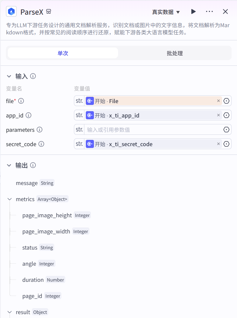 - 输出字段说明:result.detail / result.markdown 等,输出重点使用: