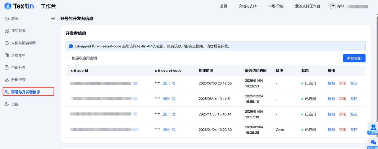 - 在TextIn控制台(https://www.textin.com/)「开发者信息」中获取