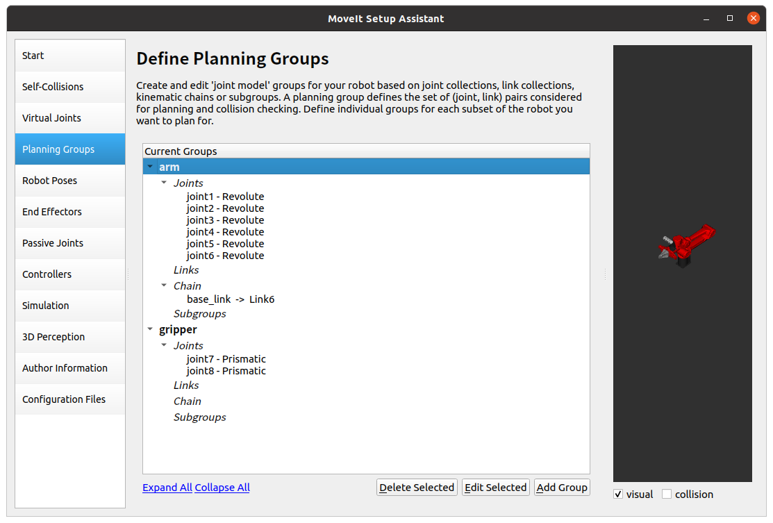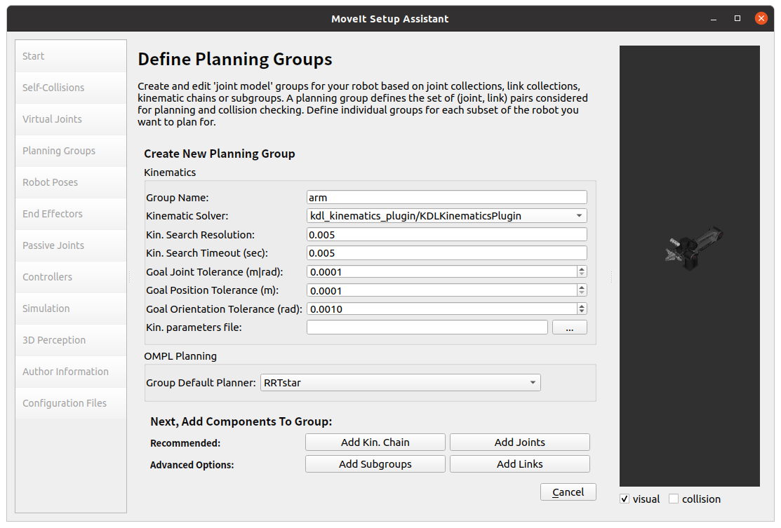 跳过选择虚拟关节;来到定义规划组;我们这里需要创建两个规划组,机械臂规划组和夹爪规划组;这里先创建机械臂规划组;Group Name设为arm,运动学求解器使用KDL,OMPL Planning 选择RRTstar