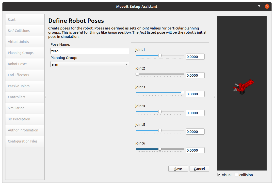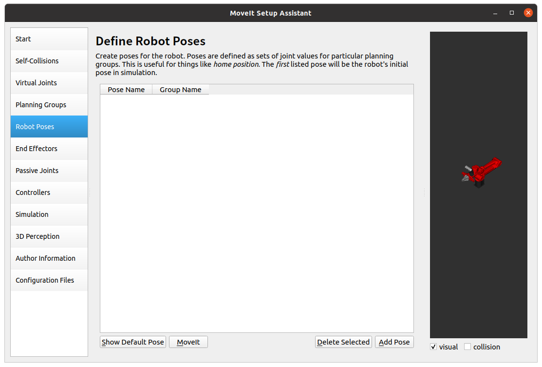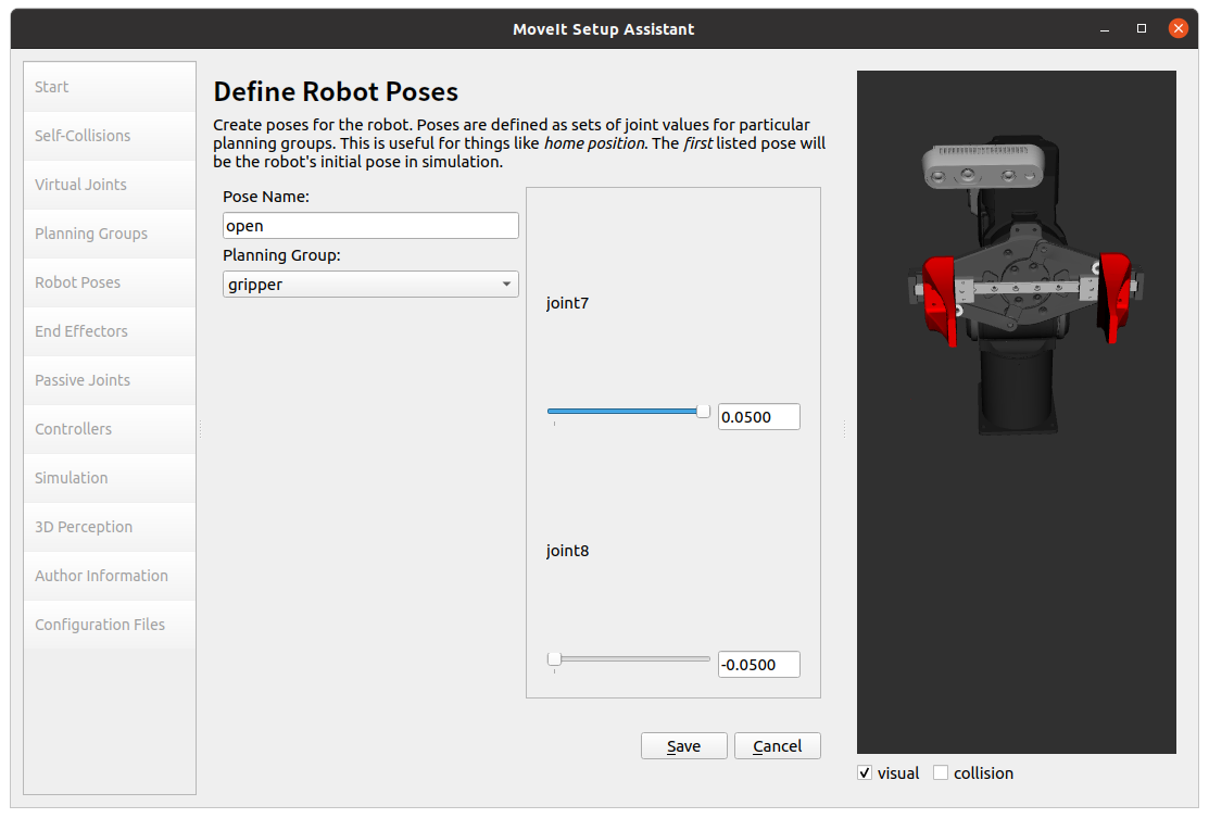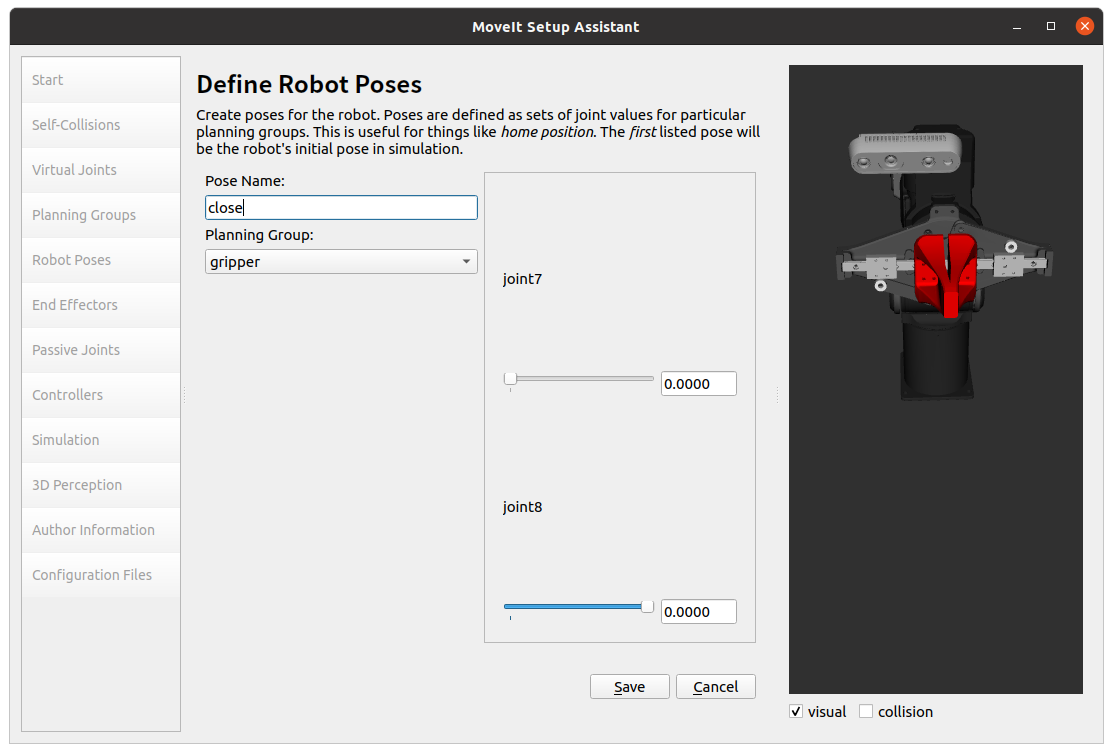 设置Robot Pose;在这里可以预先设置好规划组的一些动作;因为是二指夹爪,必须得设置夹爪打开和闭合的动作