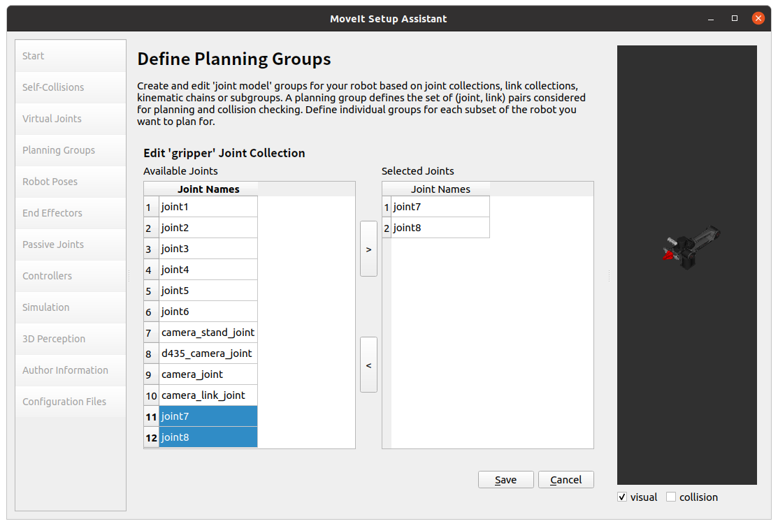 添加规划组的控制关节,选择joint7~joint8,点击>,然后保存