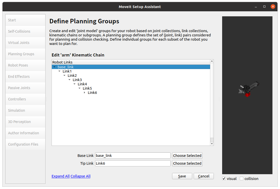 添加规划组的控制关节,选择joint1~joint6,点击>,然后保存
