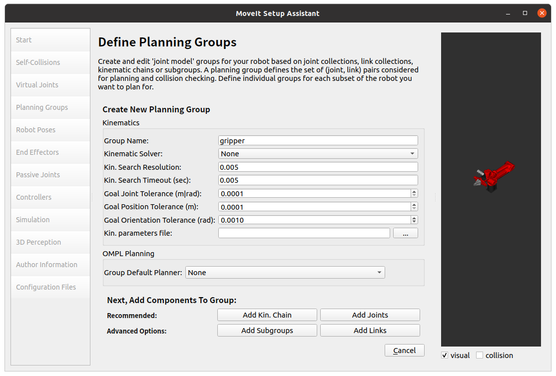 创建gripper的规划组,步骤略有不同;因为夹爪的只有两个关节,所以不需要用到运动学求解器和OMPL