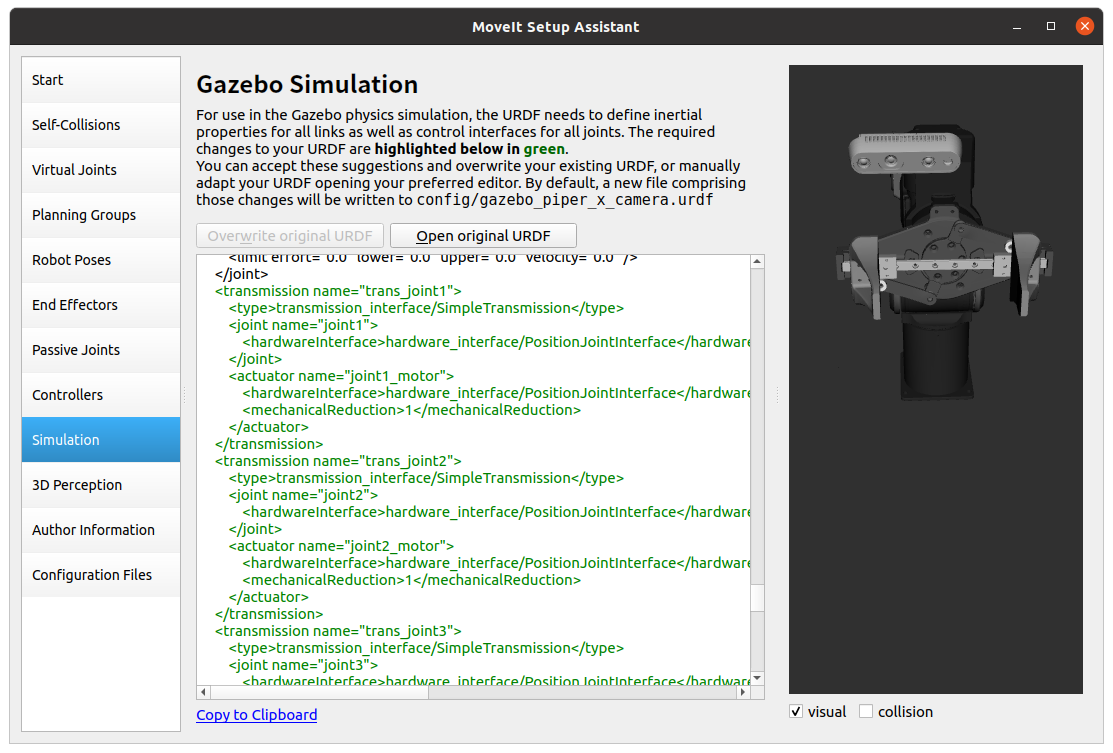 Simulation 会生成和gazebo中使用的URDF文件,里面添加了关节的电机属性等物理属性