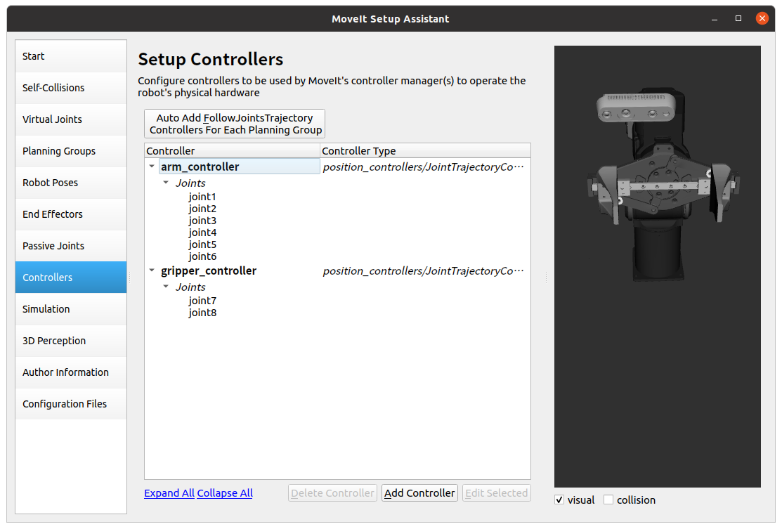 跳过End Effectors和Passive Joints;设置控制器,这里使用的是position_controllers