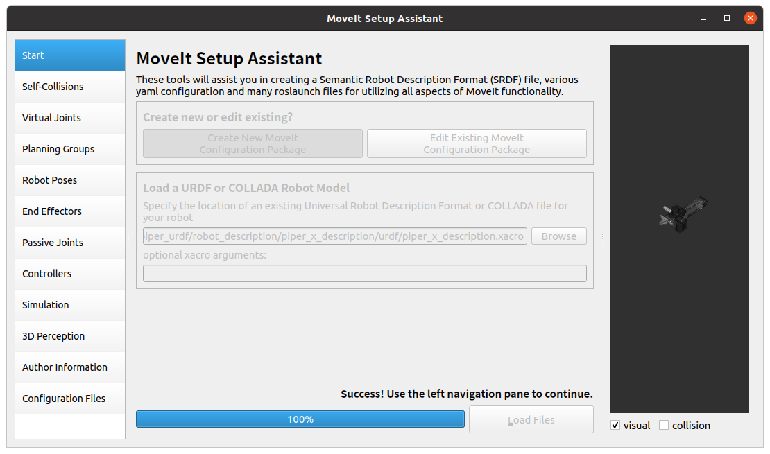 选择Create New Moveit Configuration Package;创建一个新的Moveit功能包;然后加载机械臂