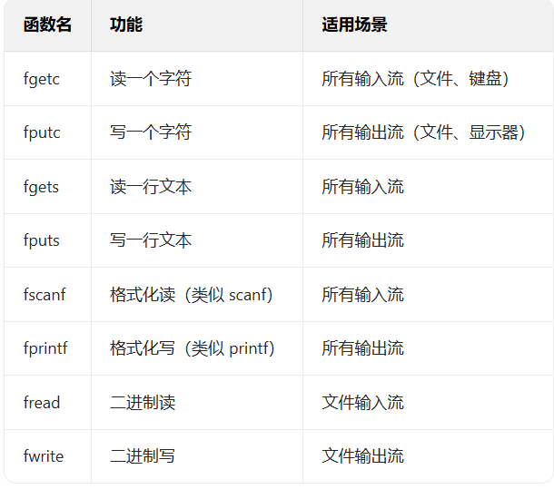 顺序读写就是从文件开头开始,读 / 写完一个数据后,指针自动移到下一个位置,不能跳着来。常用函数如下(记熟这些就够日常用了):