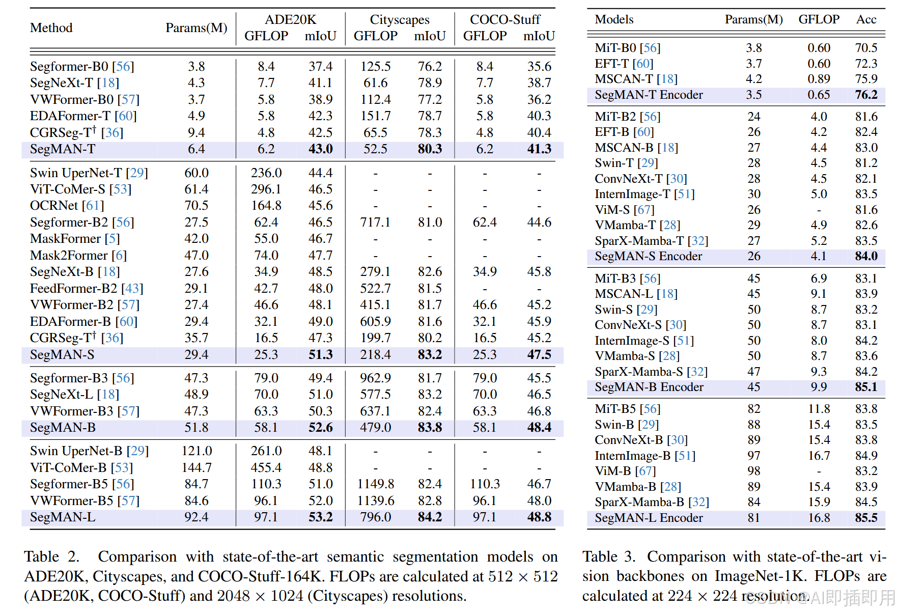 ADE20K :SegMAN-B 达到了 52.6% mIoU,比同量级的 SegNeXt-L 高出 1.6%,且 GFLOPs 减少了 15%。