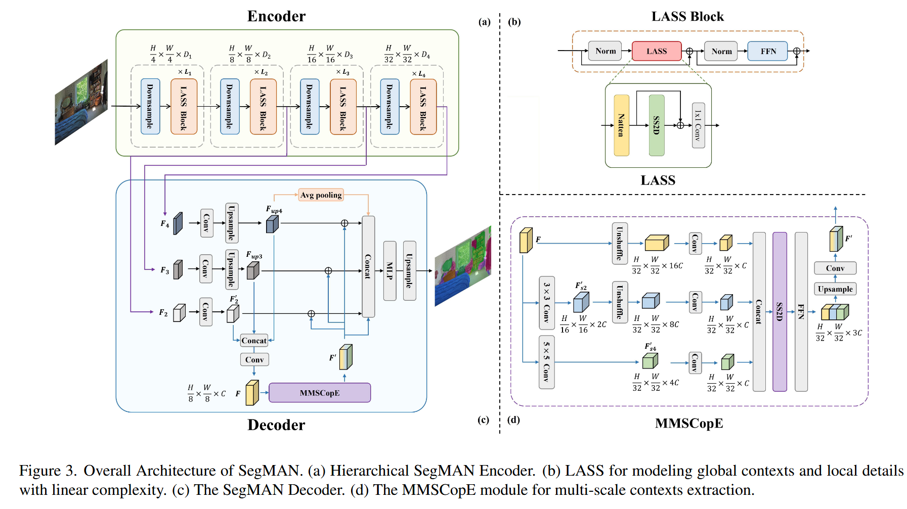 本文提出了 SegMAN ,一个线性时间复杂度的语义分割模型,旨在同时解决高效全局建模、高质量局部细节保留和多尺度特征提取三大难题。其核心创新在于编码器引入了 LASS(Local Attention and State Space) 模块,巧妙结合了用于局部细节的滑动窗口注意力(Natten)和用于全局建模的动态状态空间模型(VMamba/SS2D)。同时,解码器设计了 MMSCopE 模块,利用Mamba机制在单次扫描中自适应地处理多尺度特征。实验表明,SegMAN在ADE20K、Cityscapes和COCO-Stuff上均取得了新的SOTA性能,且计算效率优于SegFormer和SegNeXt等主流模型。