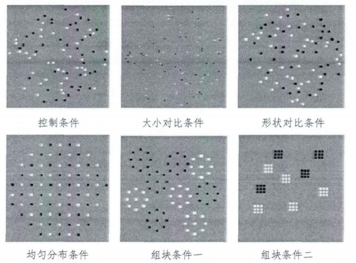 刘炜等人(2013)对此进行了实验。实验对被试同时呈现两张图,左右两张并列呈现(如图1(a))。一张为包含81个客体的恒定刺激,另外一张为比较刺激。比较刺激包含的客体可能为60、67、74、90、99、110。两张图片的呈现时间为500ms,呈现结束后需要被试判断那边的图片呈现的客体数量多。为了弄清楚是那种因素影响着数量感知,实验对恒定刺激进行6种设置(图1(b))。包括控制条件,这种条件下恒定刺激为随机分布的黑白方块;大小对比条件,其客体面积对比控制条件的小;形状对比条件,此时客体的形状从方块变为圆;均匀分布条件,恒定刺激从随机分布改为均匀分布;组块条件1,恒定刺激为9个随机分布的圆形点阵,每个点阵均由9个黑色或白色方块组成,共81个方块;组块条件2,恒定刺激为9个随机分布的方块点阵,每个点阵均由9个黑色或白色方块组成。组块条件2下点阵的密度比组块条件1的高。在所以条件下,比较刺激均为随机分布的黑色或白色方块。通过实验结果和其他的一些研究可以得出下面两个结论。