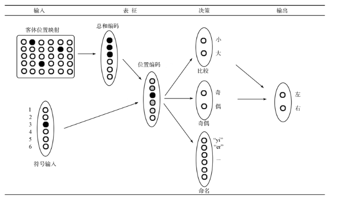 对于符号数的感知,则直接省去了客体位置映射和总和编码,它能直接激活位置编码。符号和特定的位置编码之间的联系是通过后天学习而得的。