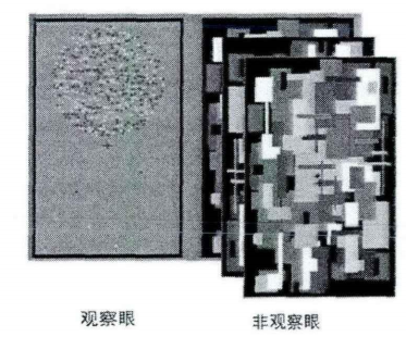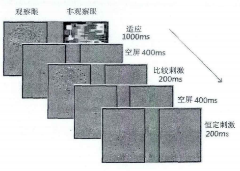 在测试阶段,被试需要做的是,分别用观察眼和非观察眼对测试刺激进行观察,判断那个位置(上方还是下方)的客体数量多。实验的目的是通过视觉后效的双眼传递特性来测试数量感知与意识的关系。根据数量适应理论,在适应条件下,因为观察眼上方的适应点数较多(405个),所以在该处适应后会低估比较刺激数量;又因为观察眼下方的适应点较少(5个),所以在该处适应后会高估恒定刺激的数量。