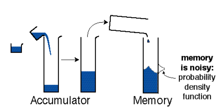 Cordes(Cordes,Gelman和Gallistel,1983)将被计数的刺激比喻成杯子中的液体,每个刺激可比喻成一个装有液体的杯子。每个刺激都会使累计器累计激活,即当刺激项目越多时累计器的激活程度就越大。累计器可以比喻为一个大的容器,可存储杯子中的液体。当杯子越多时,容器中的液体就越多。场景客体的数量与累计器呈线性关系。累计器的激活程度可以与存储在记忆中的激活程度相比较。或者说,累计器处于不同激活程度对应不同数值的符号。当累计器的某一激活程度对应于某一符号时,该符号的数值就是计数得到的数值。又因为刺激在记忆中的数量感是波动的和变化的,所以这种非语言计数是不准确的。如图4。该模型被称为模拟量模型(又称为累加器模型)。