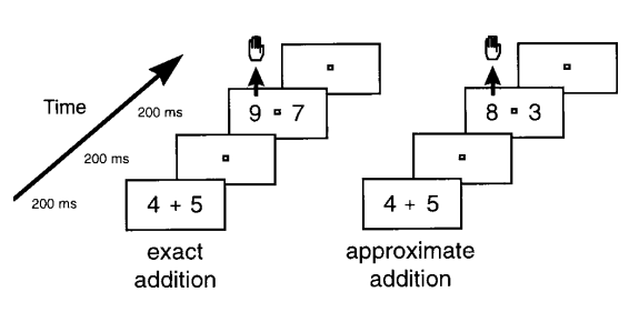 Dehaene等人(Dehaene,Spelke,Pinel,Stanescu和Tsivkin,1999)通过数学加法研究语言习得与数字处理的关系,实验过程如图3所示。该研究包括两种加法条件,第一种是精确值加法条件,即先呈现一个简单加法(如4+5),之后呈现两个数字(9和7),其中一个数字是加法之和(9),被试需要判断这两个数字哪个是加法的和(4+5=9);第二种是近似值加法条件,先呈现一个简单加法(如4+5),然后呈现两个数字,这两个数字均不是加法之和(8和3),而被试需要选择出最接近加法和的一个(即8)。该研究也包括两种语言条件,俄语和英语。在进行测试前,需要使用该流程对被试进行训练(让被试熟悉流程)。实验结果表明,在精确值加法条件下,当训练和测试所使用的语言是一致的情况时(都是俄语或都是英语),被试在测试过程中的反应时间要明显低于语言不一致的情况。而在近似值加法条件下,训练和测试所使用的语言是否一致对被试的反应时间没有影响。这说明了,精确值运算需要依赖后天语言,而近似值运算不依赖后天语言。