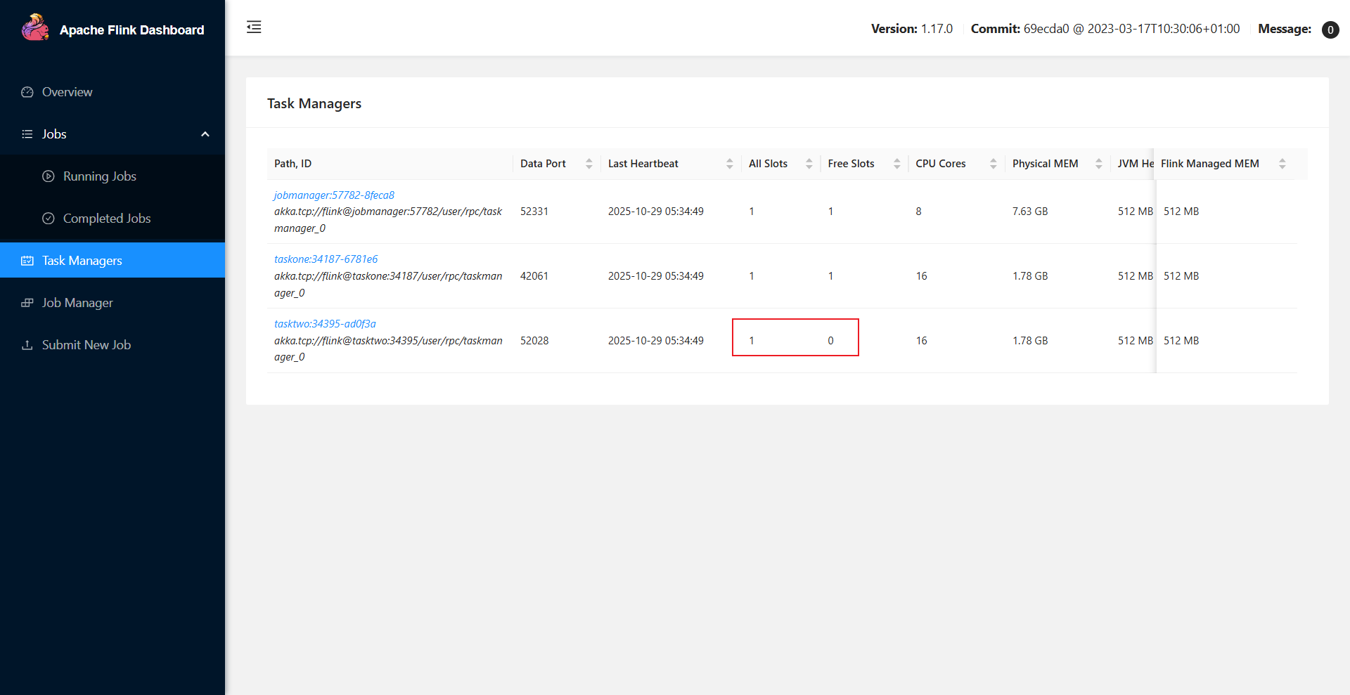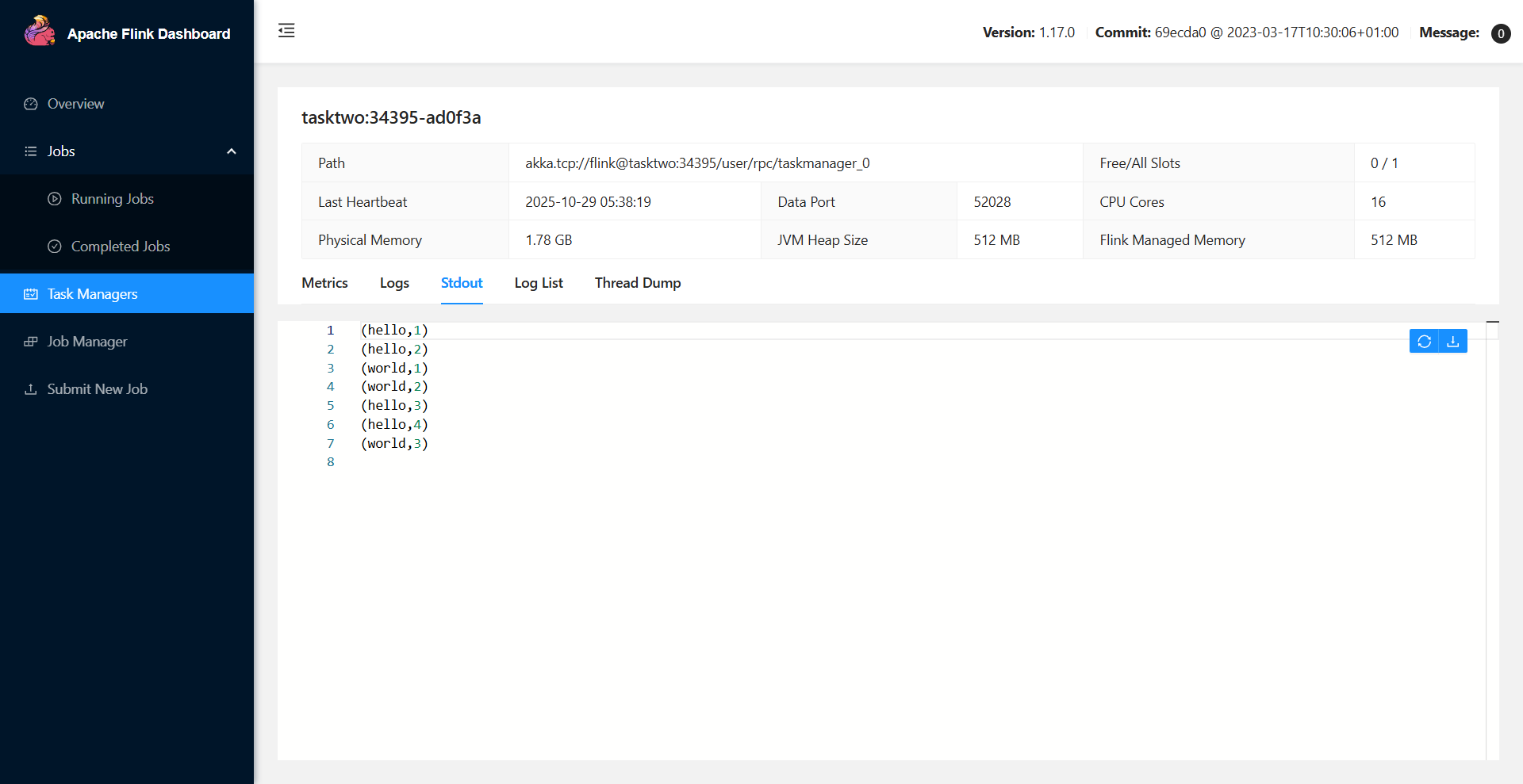 这时我们在Task Manager标签下发现taskTwo节点的资源减少了,说明我们的任务运行在了TaskTwo节点,我们点击进入TaskTwo节点查看他的Stdout就能看到对应的输出