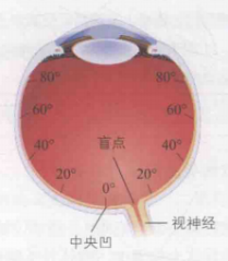 眼球上大约有600万个视锥细胞和1.2亿个视杆细胞。其中,视锥细胞主要集中于极小范围的中央凹区域,并在中央凹处具有密度较高(约5万个),而在外周视网膜上密度较低;相反,视杆细胞则主要分布在大范围的外周视网膜上,如图3(b)所示。