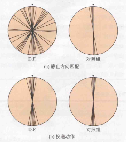 视觉是服务于行为的,为的是能更好的和世界互动。因此Milner和Goodale(1995)认为,背侧通路与动作的实施有关。位置通路除了有空间信息,还涉及与物体的交互。为了证实这个观点,他们设计了如下实验。DF是一位脑颞叶的脑损伤者,实验要求她将卡片与插槽对齐但不用插入。这是一个识别任务,因为颞叶受损导致她无法辨别线条,所以她的对齐位置非常分散。如图21(a)左侧所示,而右边是正常人的测试结果。另外一个任务是将卡片插入插槽,因为她无法对齐所以她理应也无法插入。但是她做到了,如图21(b)所示。对此的解释是,识别和动作是双分离,即一个功能的损失未必会导致另外一个功能的损失。即便腹侧通路受损(无法识别方向),也不影响插入任务。基于此,研究者认为背侧通路更应被称为动作通路或者方式通路。