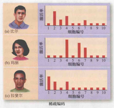 感觉的神经表征,即大脑的放电模式,被称为感觉编码。目前存在三种主要的感觉编码假设。第一种是特异性编码,指的是一个细胞仅会被一个特定的物体激活。例如,在图22(a)中,不同的细胞分别被不同的人激活:比尔对应4号细胞,玛丽对应9号细胞,拉斐尔对应6号细胞,而其他细胞则处于静息状态。这种高度特异化的细胞形象得就像当遇到关于祖母的概念时细胞会激活,因而也被称为"祖母细胞"。第二种是群体编码,它认为任何一个物体都会引发大量特征察觉器的反应,但不同物体引起的反应模式各不相同,从而实现不同物体的区分。如图22(b)所示,尽管三人都激发了多个细胞的反应,但他们所对应的反应模式各有差异。最后一种是稀疏编码,与前两种编码方式相比,这种编码仅激活部分特征察觉器(数量少于全部,但多于一个),其余的则保持静止,如图22(c)所示。由于群体编码和稀疏编码均涉及多个神经元的协同作用,它们也被称为分布式编码。