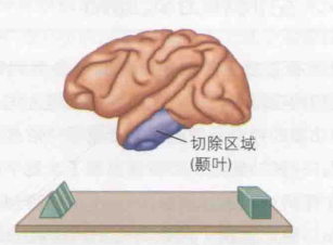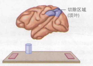 识别和定位是视觉的两大核心任务。为了确定识别和定位功能对应的脑区,Ungerleider和Mishkin(1982)对猴子进行了大脑切除术(如果丧失某项功能,即可确定被切除的脑区负责该功能),并设计了两项测试:客体识别任务和地标辨别任务。在客体识别任务中,猴子需要识别两个不同形状的物体,一个是目标物体(如长方体),另一个是非目标物体(如三棱柱)。若猴子能识别目标物并移开目标物体,即可获得食物奖励,如图20(a)。在地标辨别任务中,猴子的两侧各有一个盖子,当猴子移开距离圆柱体最近的盖子时,便能获取食物,如图20(b)。从枕叶的初级视觉皮层出发,存在两条主要通路:一条通往颞叶,称为腹侧通路(位于大脑腹部);另一条通往顶叶,称为背侧通路(位于大脑背部)。实验结果显示,当猴子的部分颞叶被切除时,在客体识别任务中会遭遇困难,因此可以确定颞叶与客体识别密切相关,腹侧通路也因此被称为内容通路或"what"通路。同理,当顶叶被切除时,猴子在地标辨别任务中会遇到困难,因此可以确定顶叶与定位功能相关,背侧通路则被称为位置通路或"where"通路。
