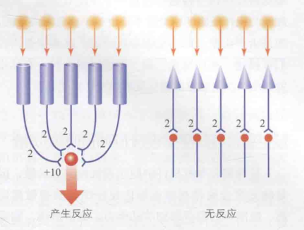 产生这种这种现象的原因在于视杆细胞发生的聚合多于视锥细胞。可以通过下图5作进一步说明:每一个光子射入一个视锥细胞,并且每个视锥细胞联结一个神经节细胞。此时,若光子强度不足(如2个强度),则不足以引起神经节细胞的反应;而多个光子分别刺激多个视杆细胞,这些视杆细胞共同连接一个神经节细胞,每个光子的强度叠加起来(如10个强度),便足以引发神经节细胞的反应。因此,相比视锥细胞,视杆细胞在微弱光线条件下更容易产生反应。