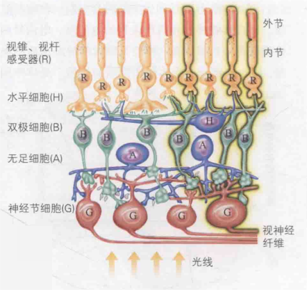 电信号生成后,依次传递至双极细胞和神经节细胞,随后神经节细胞通过视神经纤维(即神经节细胞的轴突,长度较长)将信号传送至大脑。值得注意的是,如图4,双极细胞和神经节细胞覆盖在视觉感受器的外面,此外还分布有水平细胞和无足细胞,光线正是透过这四种神经细胞抵达视觉传感器。另外,视神经纤维从外向内穿过视网膜,形成了一个盲点。然而,这一盲点通过我们大脑的高级神经处理过程得以"脑补",因此我们感知不到这个盲点的存在。