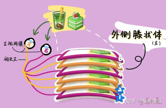 与视神经纤维非常类似,外侧膝状体的感受野也是中心-周边结构,中心是兴奋性的而周边是抑制性的,或相反。另外,外侧膝状体具有分层结构,每一层的细胞都有不同的作用。人的外侧膝状体分为六层,从下到上分别命名为第1、2、3、4、5、6层,且每层都仅表征对侧视野(左脑外侧膝状体的每一层组织与(左眼及右眼的)右视野对应;右脑外侧膝状体的每一层组织与左视野对应。例如,如图左边的外侧膝状体接收的是右侧视野的蛋糕)。当然这种对应是拓扑学上的,即在视网膜图像上相邻的点,在外侧膝状体里形成的图像上依然是相邻的,即只考虑物体间的相对相邻关系而不考虑它们的形状和大小(位置也存在一定的形变,仅存在相邻关系)。最后,外侧膝状体的神奇之处在于:同侧眼睛发来的信号,由2、3、5层细胞接收;对侧眼睛发来的信号,由1、4、6层细胞接收,如图12。