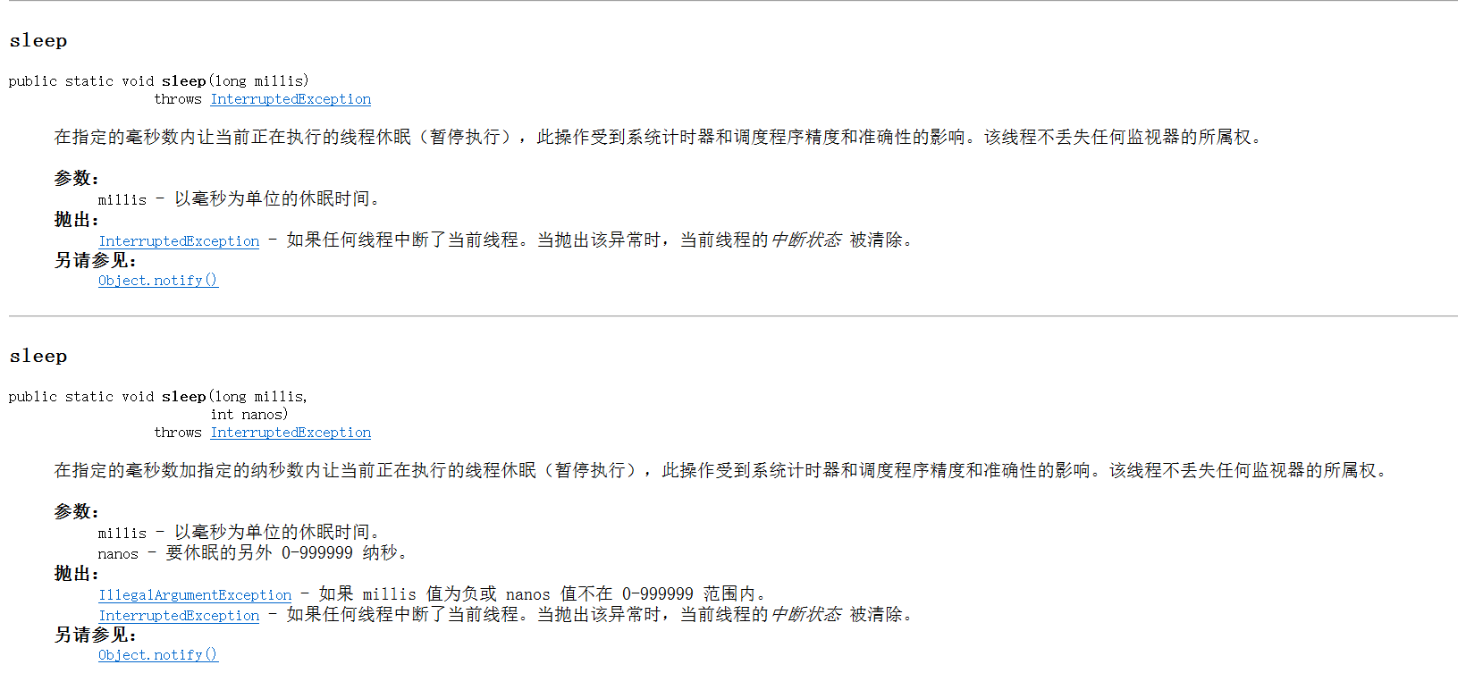 - public static void sleep(long millis) 与 public static void sleep(long millis,int nanos) 均被 static 关键词修饰了;