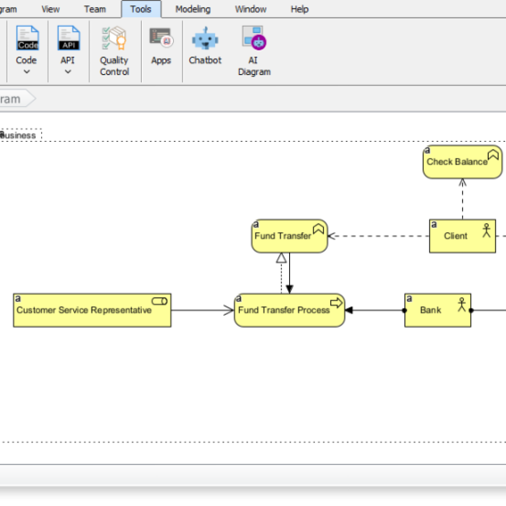 使用方式:在桌面版中进入 工具 > AI图谱生成器,选择ArchiMate视图类型,输入业务描述,系统即可自动生成多层模型。生成后用户仍可进行手动调整与细节优化,确保输出满足特定组织的业务场景需求。